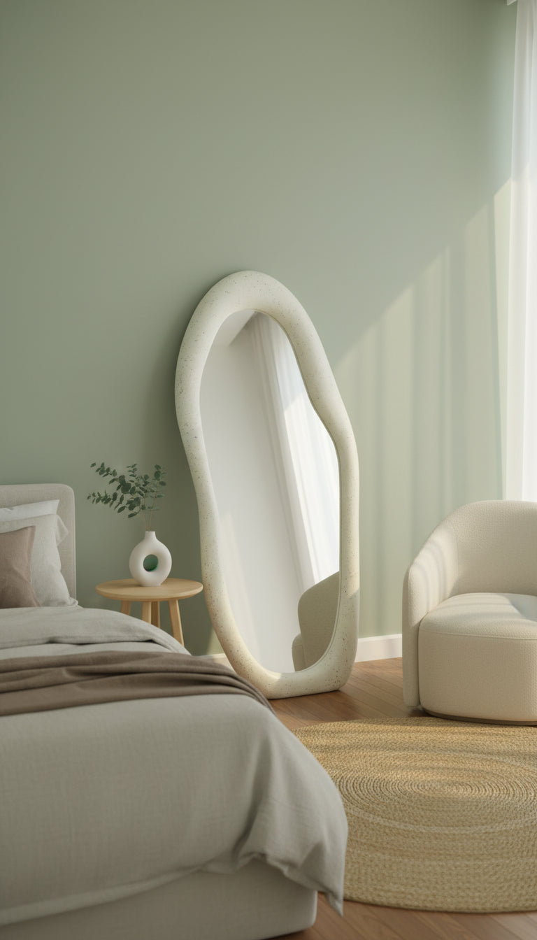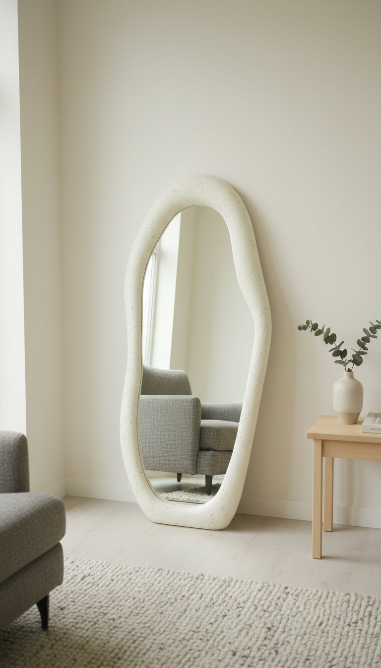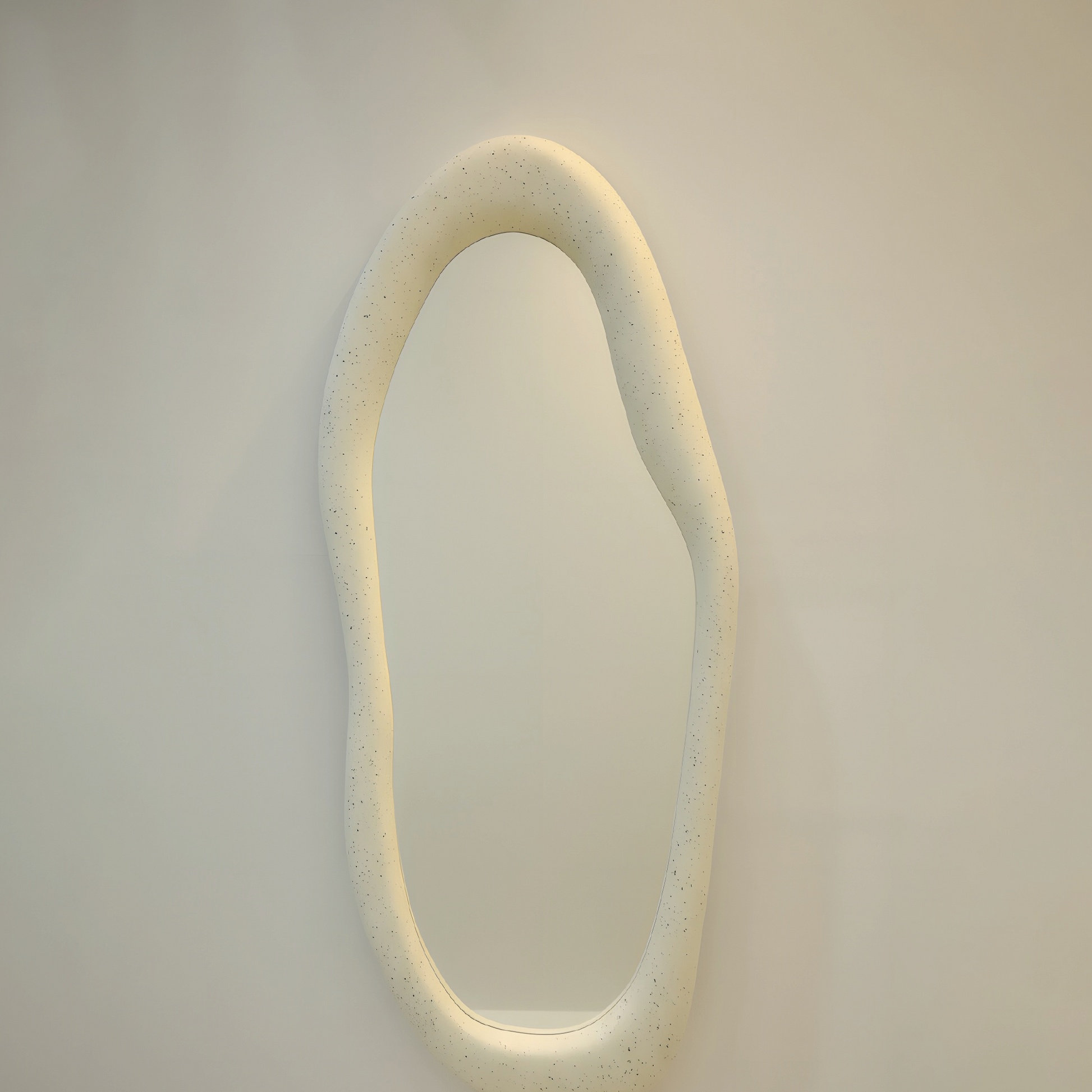 An organically shaped fiberglass mirror with a soft & speckled texture bringing calm movement and natural charm to any space.