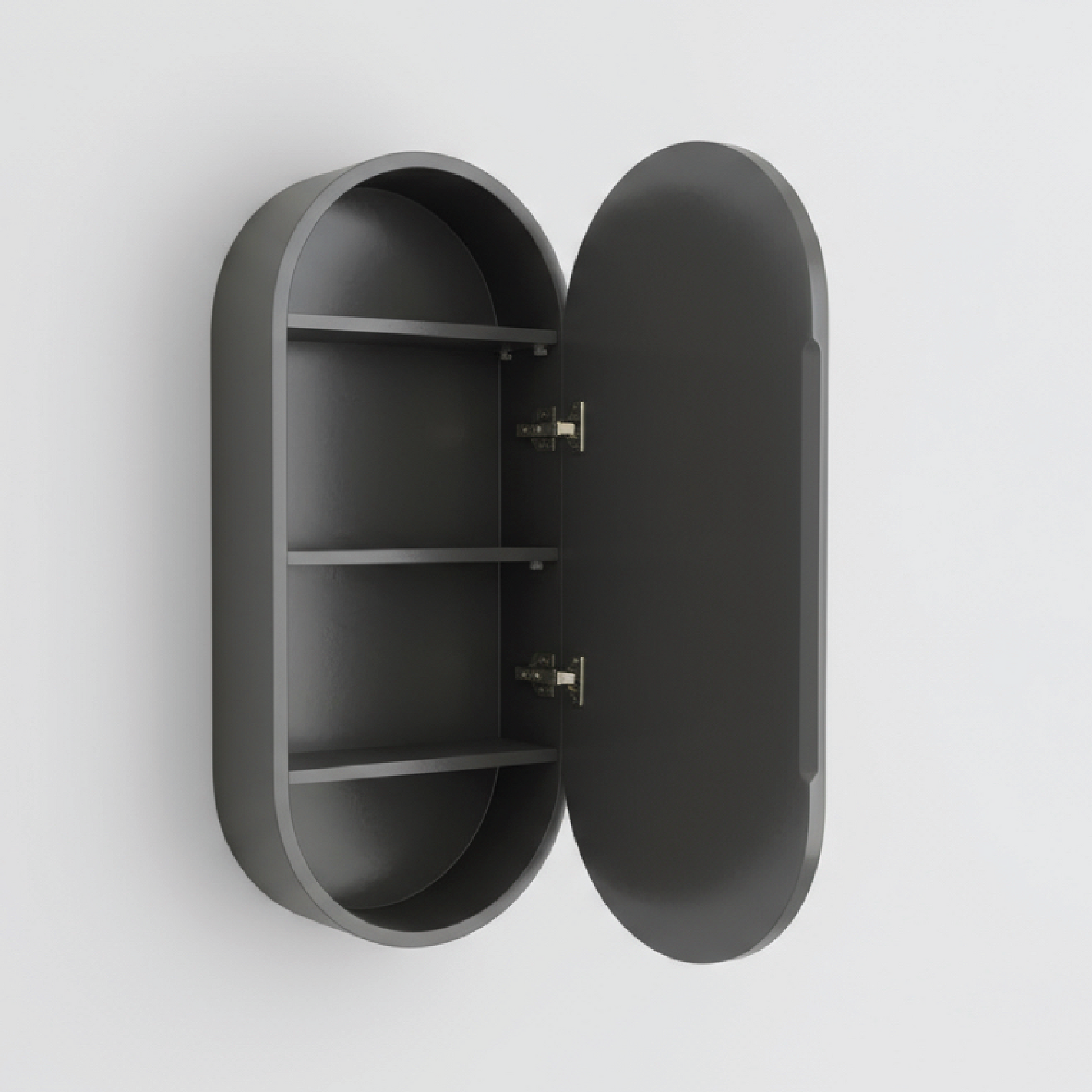The Stora wooden storage unit features an oval-shaped mirror, designed specifically for small guest bathrooms. Its compact structure optimizes space efficiency while providing practical storage for essentials.